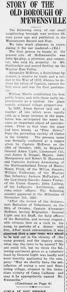 After Quigley, other settlers followed. Among them a Scotsman, Alexander McEwen, unmarried and a weaver by trade. He arrived in 1809 and first lived in the home of Thomas Wallace, a farmer of the vicinity. During the thirty years of his residence here.... When the early settlers arrived here, what is now Mc Ewensville and a large area surrounding was covered by a magnificent pine forest..... With the luxurious growth of pine all around, it is obvious how the settlement became known as Pine Grove. This name clung to for years after the Post Office Department had set the seal of approval upon the name which the town now bears. " McEwensville In History By George Wesner