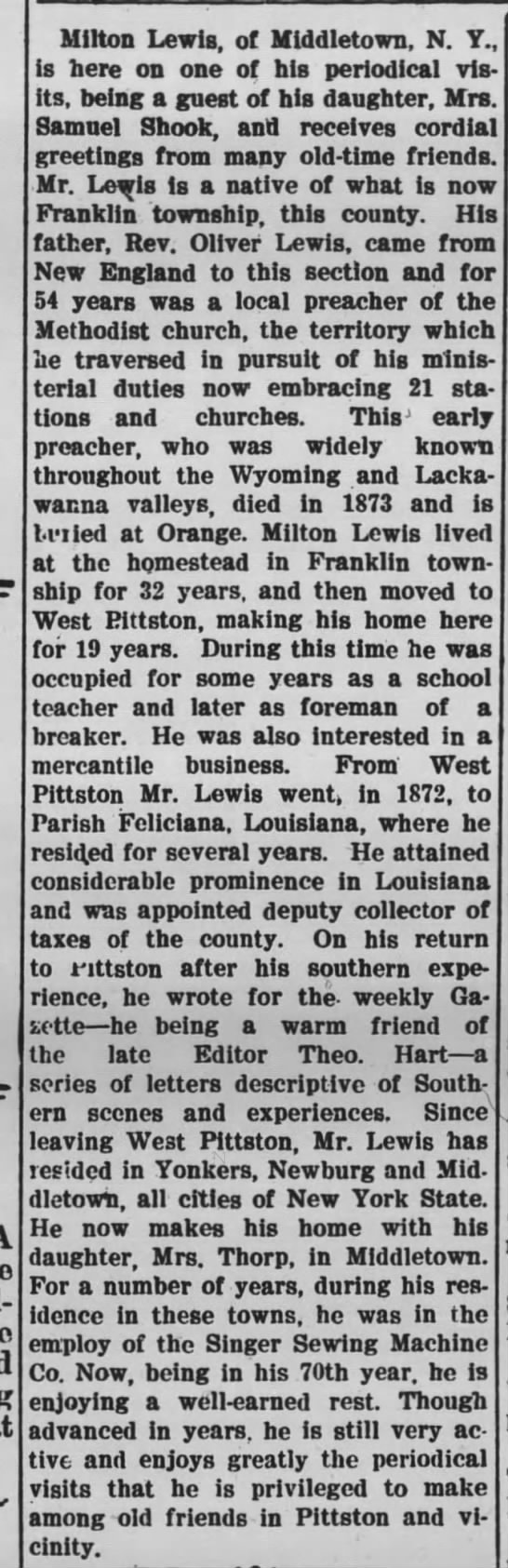 In 1872, Mr. Lewis went to Parish Feliciana Louisiana, where he was appointed deputy collector of taxes. When he returned to Pittston after his southern experience, he wrote for the weekly newspaper, the Gazette.