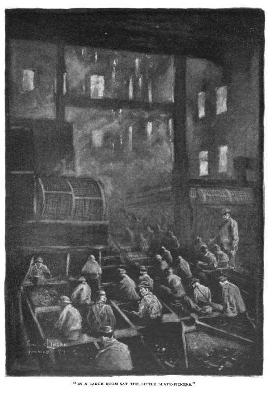 In a large room sat the little slatepickers. ‘The floor slanted at an angle of forty-five degrees, and the coal, having been masticated by the great teeth, was streaming sluggishly in long iron troughs. The boys sat straddling these troughs, and as the mass moved slowly, they grabbed deftly at the pieces of slate therein. ‘There were five or six of them, one above another, over each trough. ‘The coal is expected to be fairly pure after it passes the final boy. The howling machinery was above them. High up, dim figures moved about in the dust clouds.