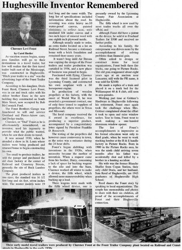 Clarence Levi Foust, born in 1900 in Lycoming County. He opened a garage and built trailers in Hughesville. In 1940, he expanded to making wooden propellers. He invented a 5th wheel design for wagons, which is still used today. Foust's son in law wrote that he was Hughesville's Most Important Forgotten Man, and described his achievements.
