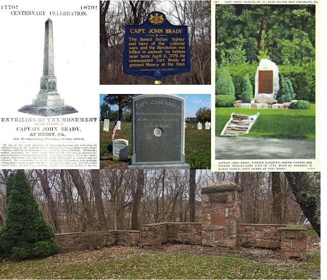 His body was brought to the fort and soon after interred in the Muncy burying ground, some four miles from the fort (now Hall's station, P. & E. R. B.) over Muncy creek." His grave is suitably marked at Hall's, while a cenotaph in the present Muncy cemetery of thirty feet high, raised by J. M. M. Gernerd by dollar subscription, attests the lively interest still felt by the community in one who devoted himself to the protection of the valley when brave active men and good counselors were needed. Of his sons, Capt. Samuel Brady, a sharpshooter of Parr's and Morgan's rifles, fought on almost every battlefield of the Revolution, from Boston and Saratoga to Germantown, can speak of his deeds as a scout and Indian fighter Western and Northern Pennsylvania, which West Virginia and Ohio attest. To the Indian he became a terror, and he fully avenged the blood of his sire shed at Wolf run, on the West Branch of the Susquehanna, that beautiful day in April, 1779, at the bloody fight of Brady's Bend, on the Allegheny, where, with his own hand, he slew his father's murderer and avenged his brother James, the "Young Captain of the Susquehanna," in a hundred other fights. Of his second son, James, killed by the Indians at the Loyal Sock, whose career bid fair to be as brilliant as his elder brother's but unfortunately cut off at his commencement. John, who, when but a boy of fifteen, going with his father and oldest brother to the battlefield of the Brandywine to bring back the horses, finding a battle on hand, took a rifle and stepped into the ranks and did manful duty, and was wounded. He is said to have served with Jackson at New Orleans in the War of 1812. William Perry Brady served on the northern borders in the same war, and at Perry's victory at Lake Erie, when volunteers were called, was the first to step out.